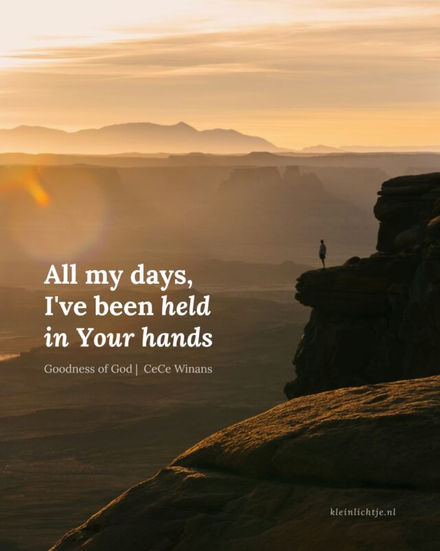 I love You, Lord For Your mercy never fails me All my days, I’ve been held in Your hands From the moment that I wake up Until I lay my head Oh, I will sing of the goodness of God ‘Cause all my life You have been faithful And all my life You have been so, so good With every breath that I am able Oh, I will sing of the goodness of God I love Your voice You have led me through the fire In darkest night You are close like no other I’ve known You as a Father I’ve known You as a Friend And I have lived in the goodness of God, yeah ‘Cause all my life You have been faithful, oh yes You have And all my life You have been so, so good With every breath that I am able Oh, I will sing of the goodness of God Your goodness is running after, it’s running after me Your goodness is running after, it’s running after me With my life laid down, I surrendered now I give You everything, oh Lord Your goodness is running after, it’s running after me Your goodness is running after, it’s running after me (oh yeah, oh yeah) Your goodness is running after, it’s running after me With my life laid down, I surrendered now I give You everything Your goodness is running after, it keeps running after me Gedeelte van het lied ๐‘ฎ๐’๐’๐’…๐’๐’†๐’”๐’” ๐’๐’‡ ๐‘ฎ๐’๐’… – CeCe Winans