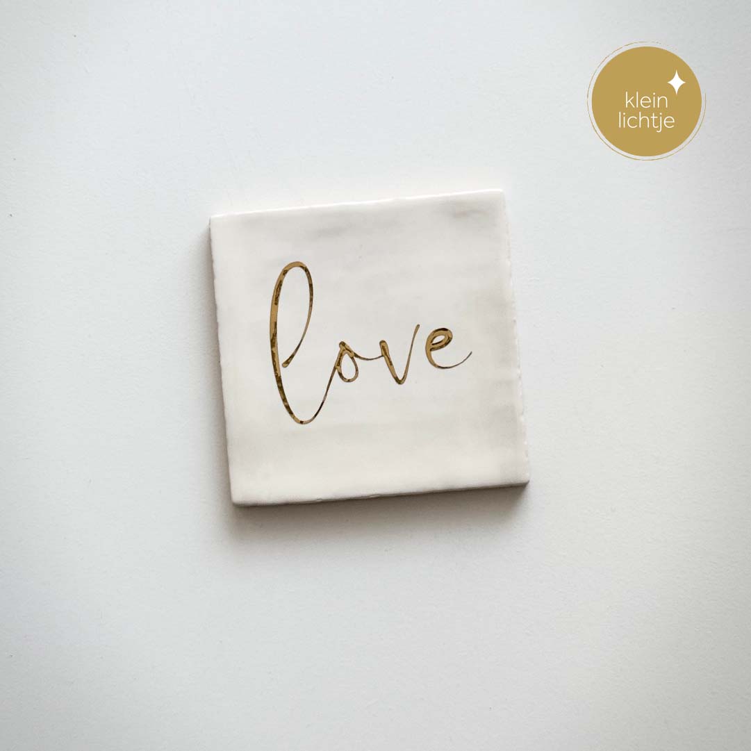 Dit handvorm tegeltje met de gouden tekst LOVE is een musthave!
